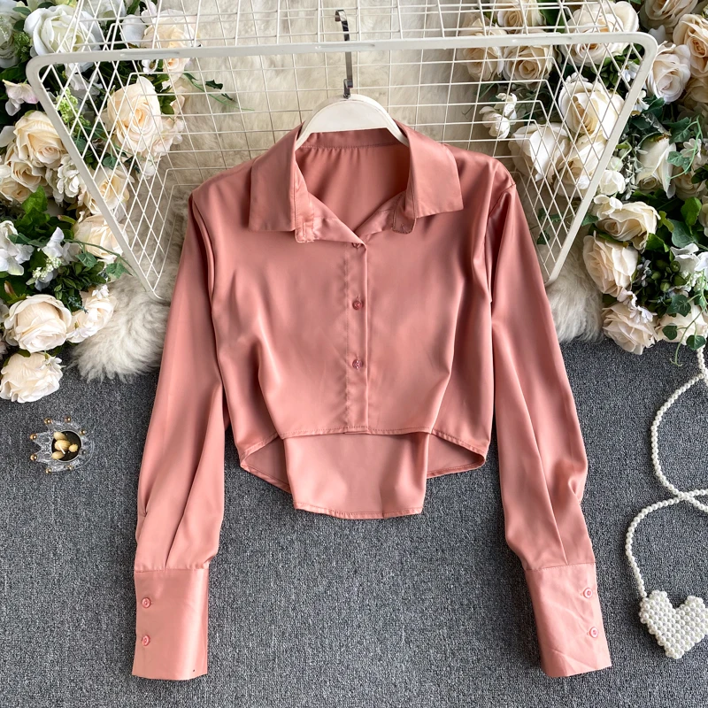Новинка осени 2020, женская рубашка, Модные Женские однотонные Короткие топы, однотонная одежда с длинным рукавом, блузка в стиле Харадзюку P919