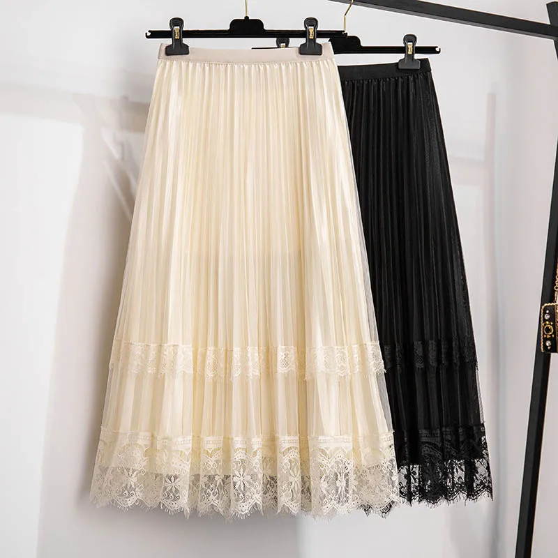 pleated skirt 5XL 6XL 7XL 8XL 9XL 10XL loose temperament lace skirt black apricot Plus size women's a-line high waist