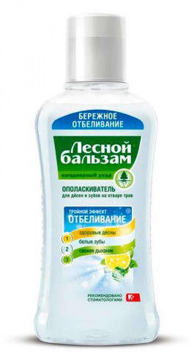 Профилактический ополаскиватель для полости рта Лесной бальзам Тройной эффект Отбеливание способствует бережному отбеливанию эмали зубов и сочетает в себе сразу 3 действия для максимальной защиты всей полости рта*: 1) Укрепляет десны, нормализует обменные процессы в мягких тканях полости рта благодаря запатентованной формуле на отваре трав.2) Защищает от кариеса и укрепляет эмаль за счет минерального комплекса с фтором.3) Сохраняет дыхание свежим и защищает от образования налета в течение дня за счет масла мяты.Ополаскиватель имеет приятный вкус трав в сочетании с мятным маслом, содержит сок лимона для интенсивной защиты от налета.Благодаря отсутствию в составе спирта, агрессивных антибактериальных компонентов и SLS ополаскиватель Тройной эффект Отбеливание поддерживает баланс микрофлоры полости рта и может использоваться ежедневно. Клинически доказано: ежедневное использование серии Тройной эффект (зубная паста + ополаскиватель) в 3 раза снижает образование налета на зубах – основной причины кариеса и проблем десен.*• Рекомендован в качестве профилактического средства для сохранения естественного цвета зубов, защиты эмали от потемнений и укрепления десен.• Использовать после каждой чистки зубов, а также после еды для очищения межзубных промежутков. • Не требуется полоскать рот водой после использования • Подходит для использования в ирригаторе• Подходит для использования в период беременности и лактации*Максимальная защита всей полости рта в линейке Лесной бальзам. Эффект на 14-й день использования зубной пасты и ополаскивателя Тройной эффект в сравнении с начальным состоянием полости рта, РФ 2013-2016.