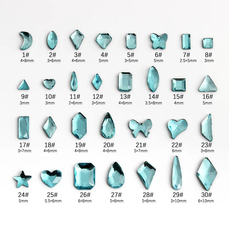 Оптовая продажа, ярко-голубые разнообразные плоские искусственные ногти, Специальные кристаллы, индивидуальное 3D украшение