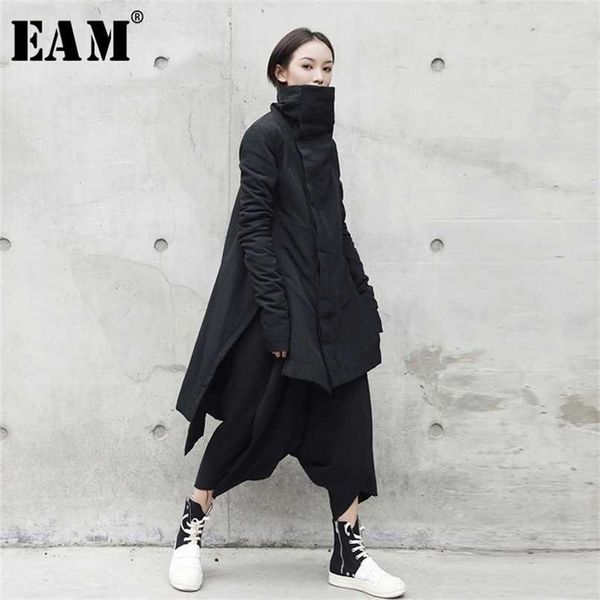 [eam] fashion winter stand lead irregular long type cotton-padded clothes loose coat solid black jacket woman ya771 211022
