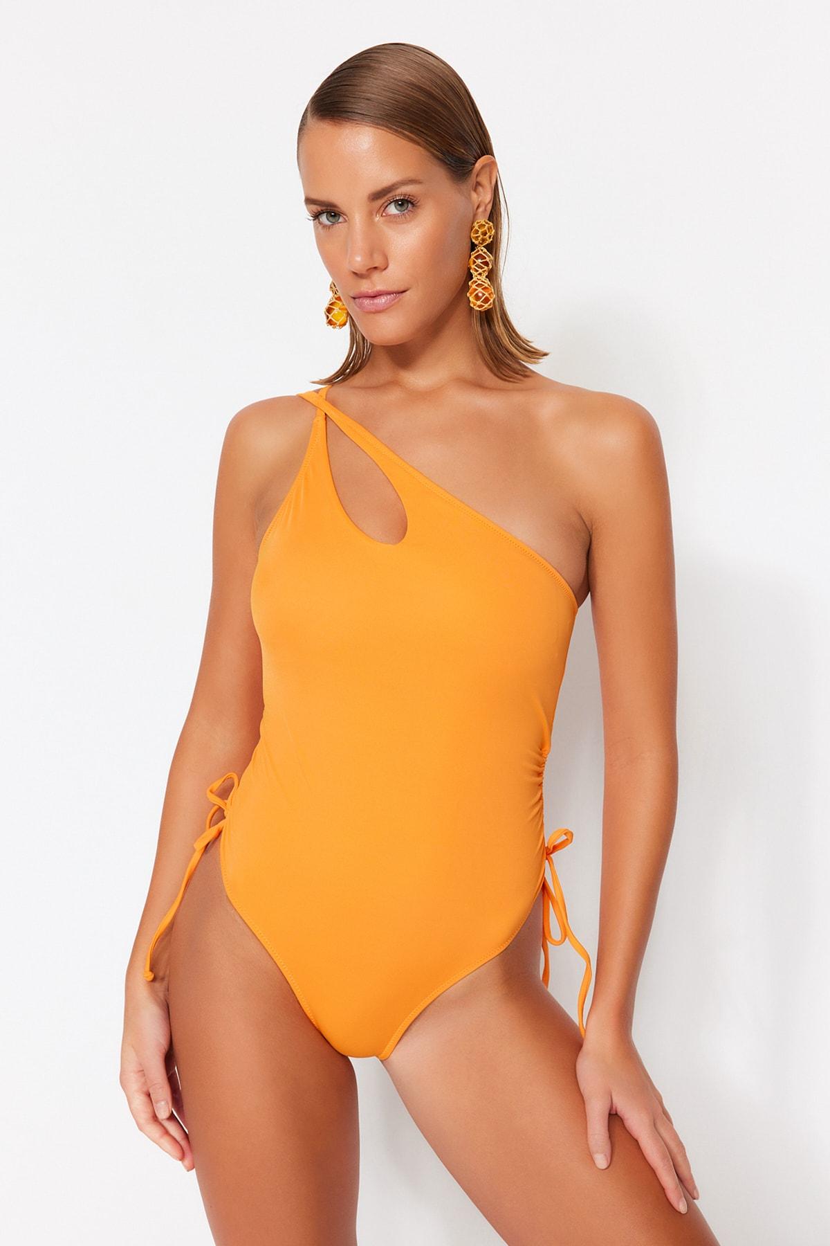 Оранжевый купальник с декольте на одно плечо стандартного кроя TBESS23MA00046..