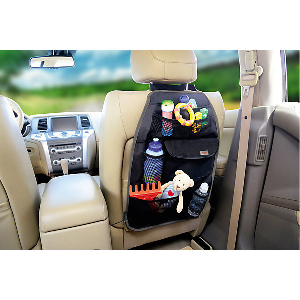 Органайзер выполнен из непромокаемого полиэстера, легко чистится, имеет универсальный размер, подойдет на сиденье любого автомобиля.