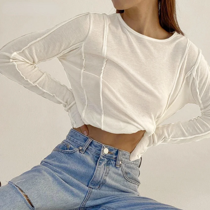 Streetwear Thin Slim Long Sleeve Female Clothing Pullover Fashion Solid Jersey O-Neck Woman T-Shirts Autumn Pleated Top New