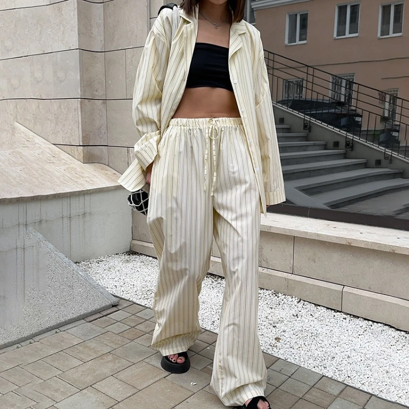 2025 Autumn New Milk Yellow Fresh Striped Long Sleeved Shirt and Pants Two-piece Set for Women
