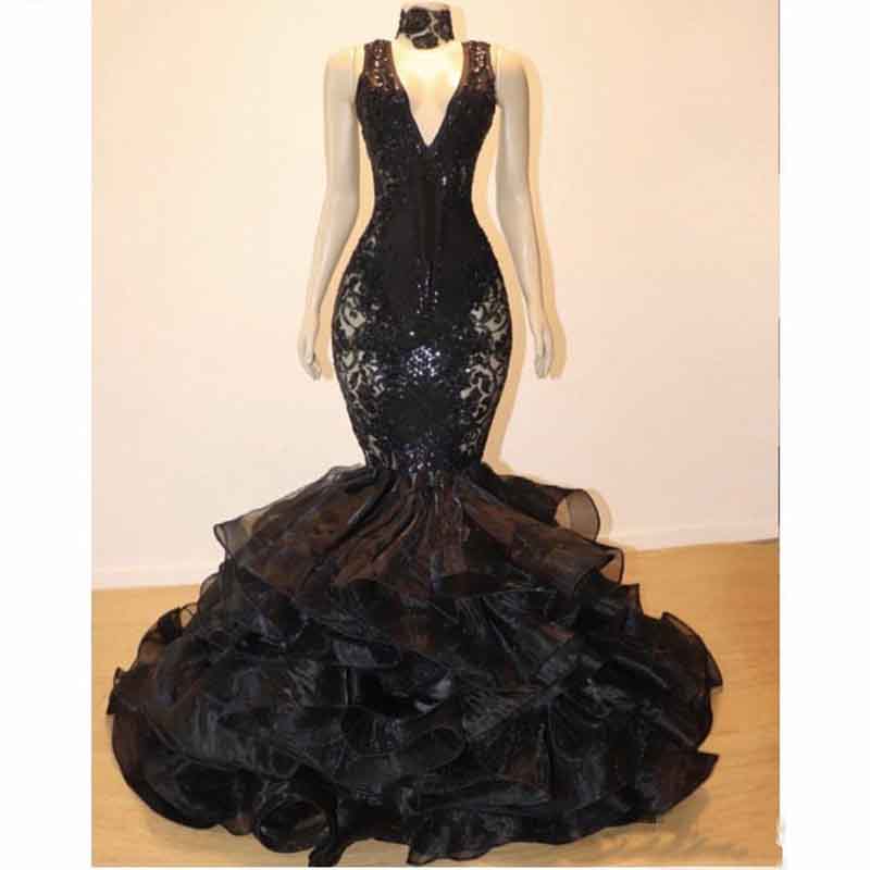 Sexy V Neck Prom Dresses Mermaid Ruffles Organza Evening Party Wear Plus Size Black Girl Lace Celebrity Party Dress, Champagne