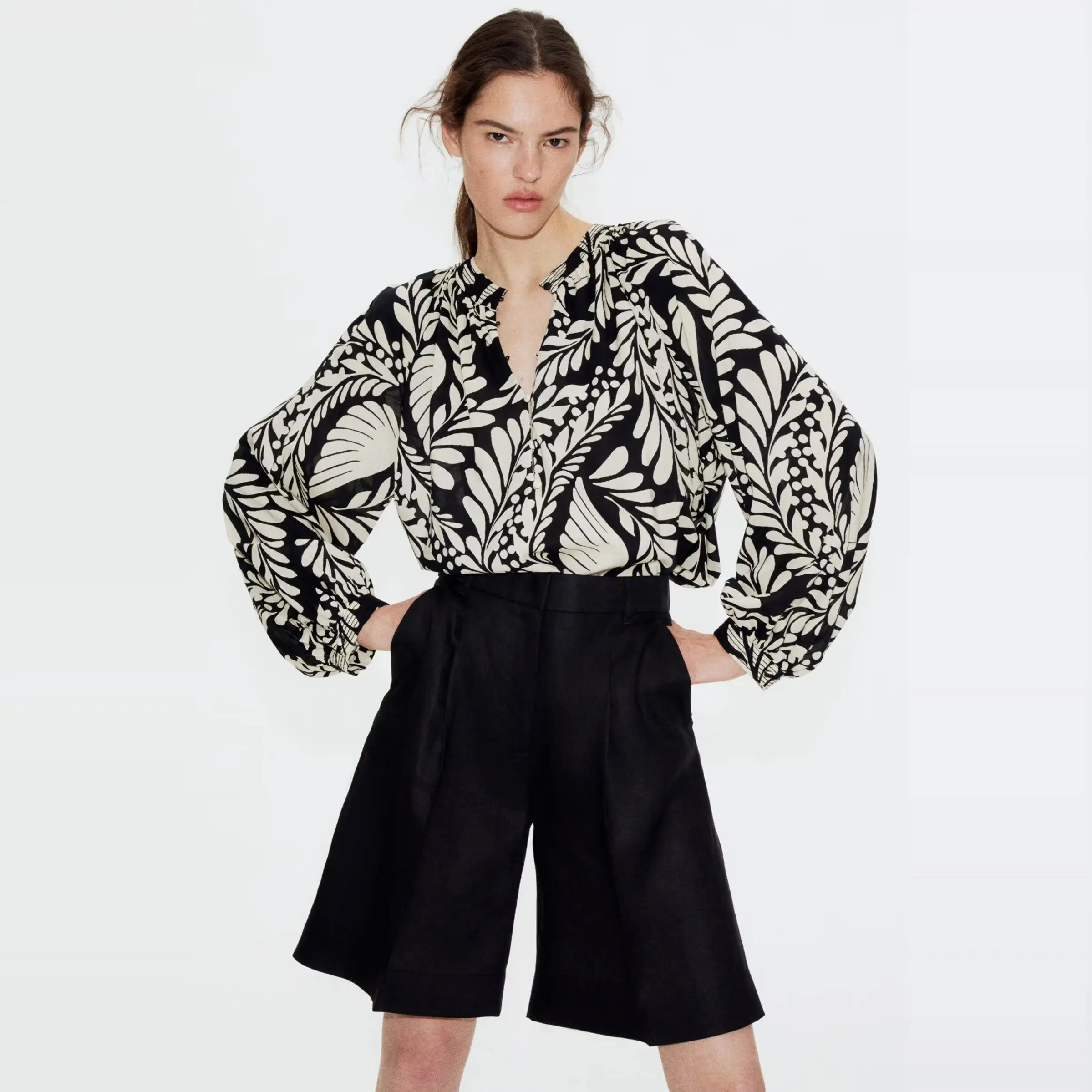 ZBZR Spring New Faionable Chinese Sle Stand Collar Women's irt Casual Loose Long Sve round Ne Printed Casual Wear