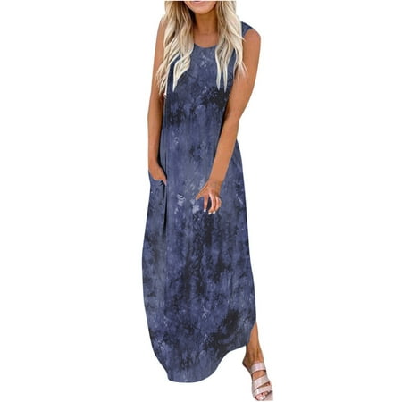 Summer Dress for Womens Bohemian Crew Neck Sleeveless Floral Printed Long Tank Dress Casual Pleat Sundress Beach Dress
