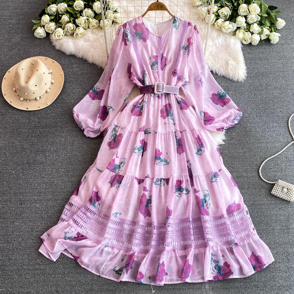 Осеннее винтажное женское длинное платье в стиле пэчворк с цветочным принтом, элегантное элегантное платье с v-образным вырезом и пышными рукавами, ажурный подол, пляжное платье для отдыха, новинка One Size фиолетовый