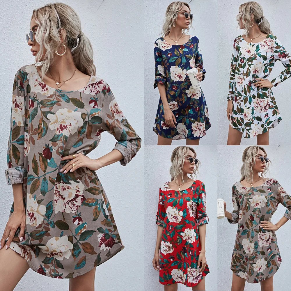 Осеннее платье для женщин 2020 хлопковое льняное платье с круглым вырезом и длинным рукавом с цветочным принтом мини-платье ТРАПЕЦИЕВИДНОЕ в...