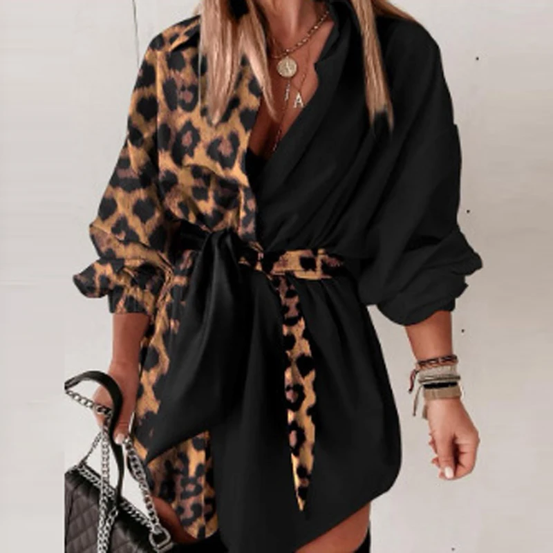 Осеннее повседневное мини-платье на шнуровке с поясом, женское винтажное женское платье-рубашка с леопардовым принтом