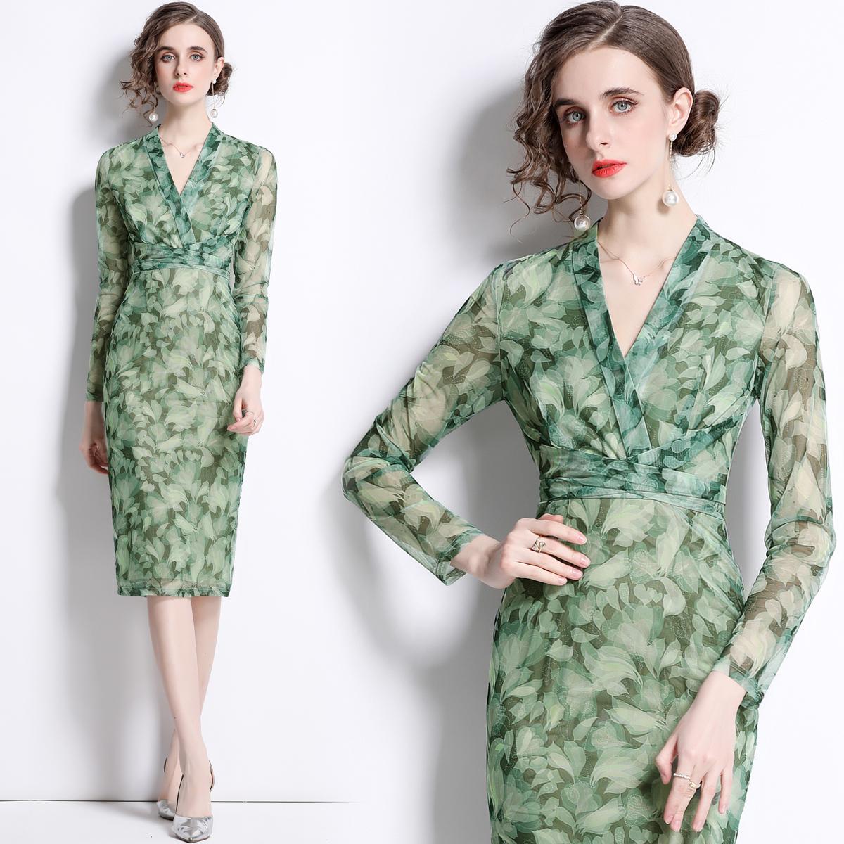 Осеннее элегантное платье с цветочным принтом зеленого чая, сексуальное облегающее платье со рюшами, женское платье миди с v-образным вырезом и длинными рукавами, драпированное, на шнуровке XXL зелёный