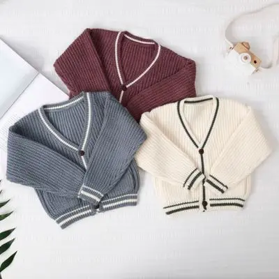 Осенне-весенние детские вязаные пальто в полоску с V-образным вырезом, Однотонный свитер для мальчиков и девочек, детская однотонная верхня...