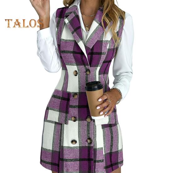 Осенне-весенний женский жилет, пальто с клетчатым принтом, отложным воротником, без рукавов, двубортный теплый жилет средней длины в стиле ретро, повседневная куртка S фиолетовый