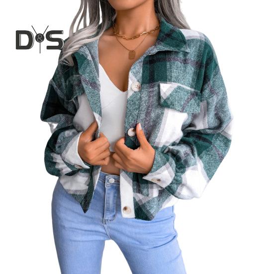 Осенне-весенняя женская куртка с контрастным клетчатым принтом, отложным воротником, однобортная модель с ложными карманами, длинными рукавами, свободное пальто для поездок на работу и свиданий XL зелёный
