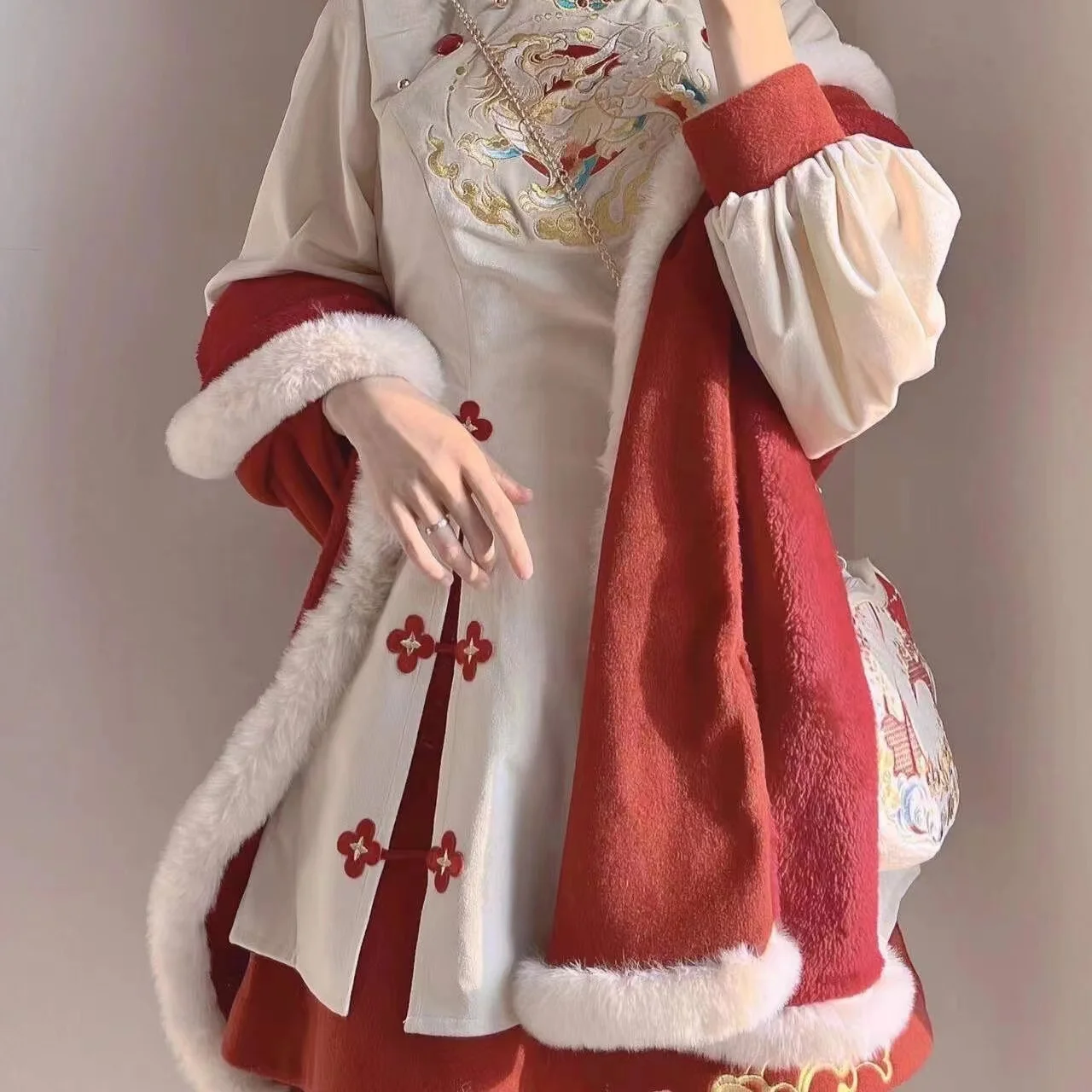 Осенне-зимнее женское Красное приталенное платье с длинным рукавом в китайском стиле с вышивкой и шалью чонсам
