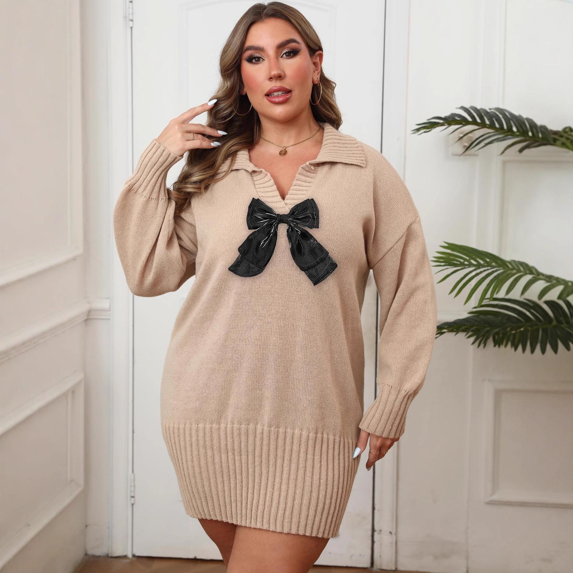 Осенне-зимнее платье, Женское платье большого размера, Воротник поло, Платье, облегающее бедра, Платье-свитер с ленточным бантом и пэчворком 0XL хаки