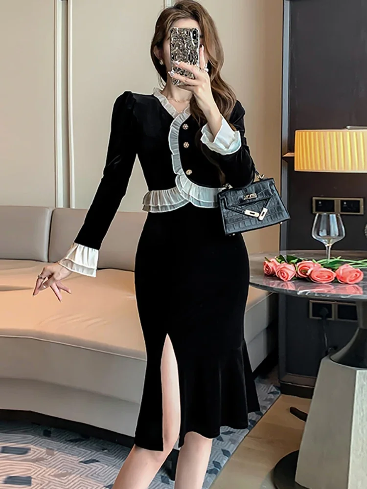 Осенне-зимнее черное бархатное платье с оборками Повседневное платье женское модное облегающее платье-Русалка 2023 корейские Роскошные вечерние платья