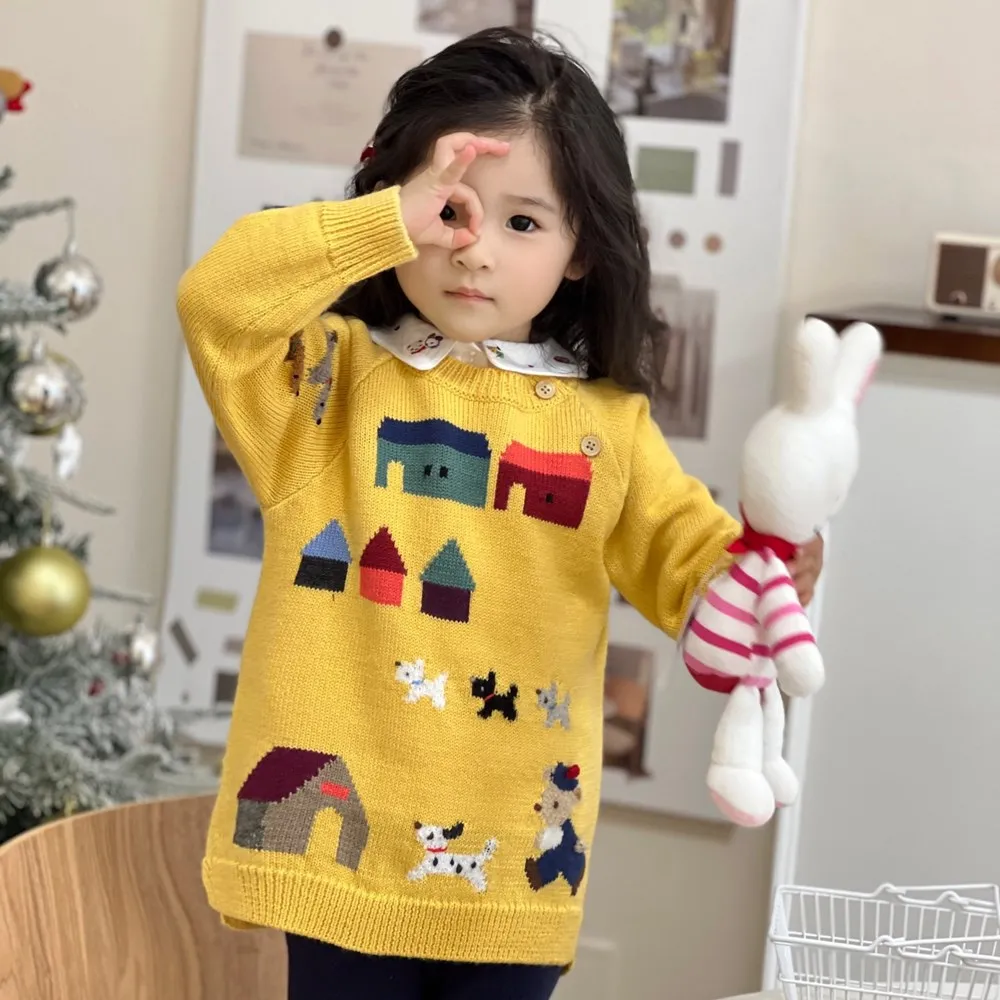 Осенне-зимние детские свитера, теплая одежда для мальчиков и девочек, желтый вязаный свитер с мультяшным рисунком собаки