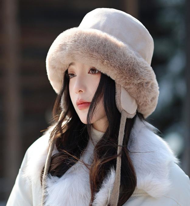 Осенне-зимние шапки для женщин Теплая ветрозащитная плюшевая шляпа-горшок для женщин Оленья кожа Бархатная шапка с защитой ушей Маленькая утолщенная шляпа рыбака One Size