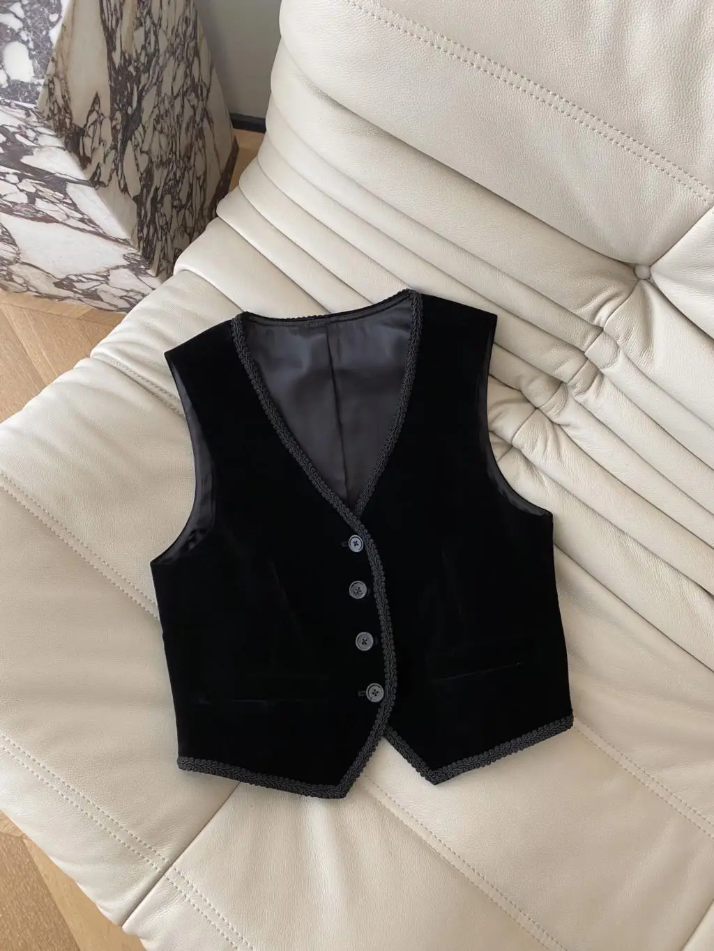 Осенне-зимний новый черный бархатный маленький жилет с манжетами на Подоле и вырезом с кружевом