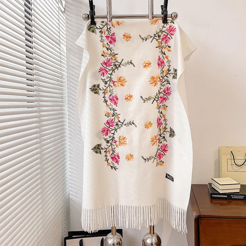 Осенне-зимний толстый простой цветочный вышитый этнический стиль теплый шарф ретро дорожная внешняя шаль 185cm белый