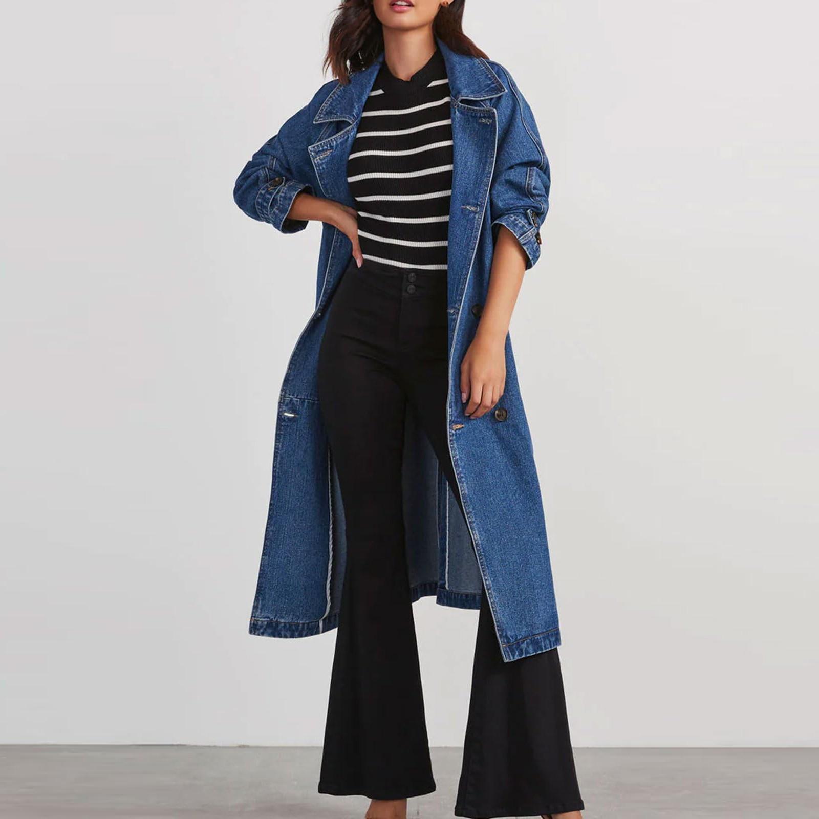 Осенне-зимняя женская ветровка из денима, хлопка, однотонная, с двойными карманами, длинная, на пуговицах, свободная куртка XL