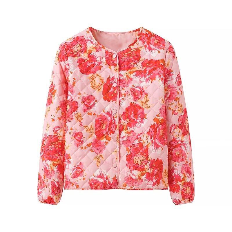 Осенне-зимняя модная куртка с круглым вырезом и длинными рукавами, розовая хлопковая куртка с цветочным принтом для женщин L розовый