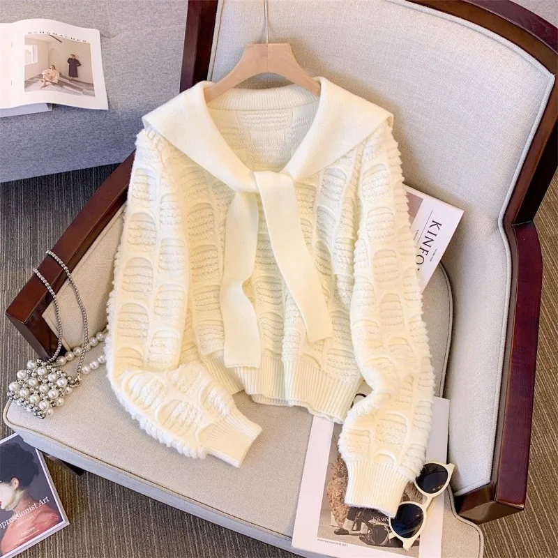 Осенне-зимняя модная новая женская элегантная дизайнерская вязаная кашемировая толстовка с капюшоном, корейская шаль в стиле ретро, темно-синий толстый свитер с воротником, джемпер