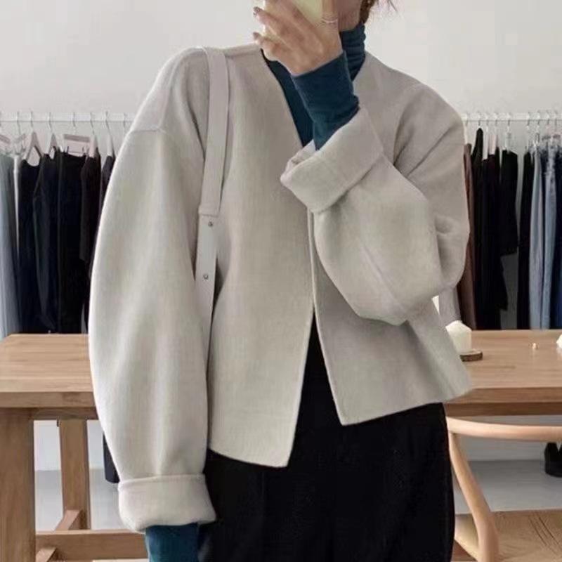 Осенне-зимняя модная свободная и универсальная двусторонняя шерстяная короткая куртка Xiaoxiangfeng с V-образным вырезом L бежевый
