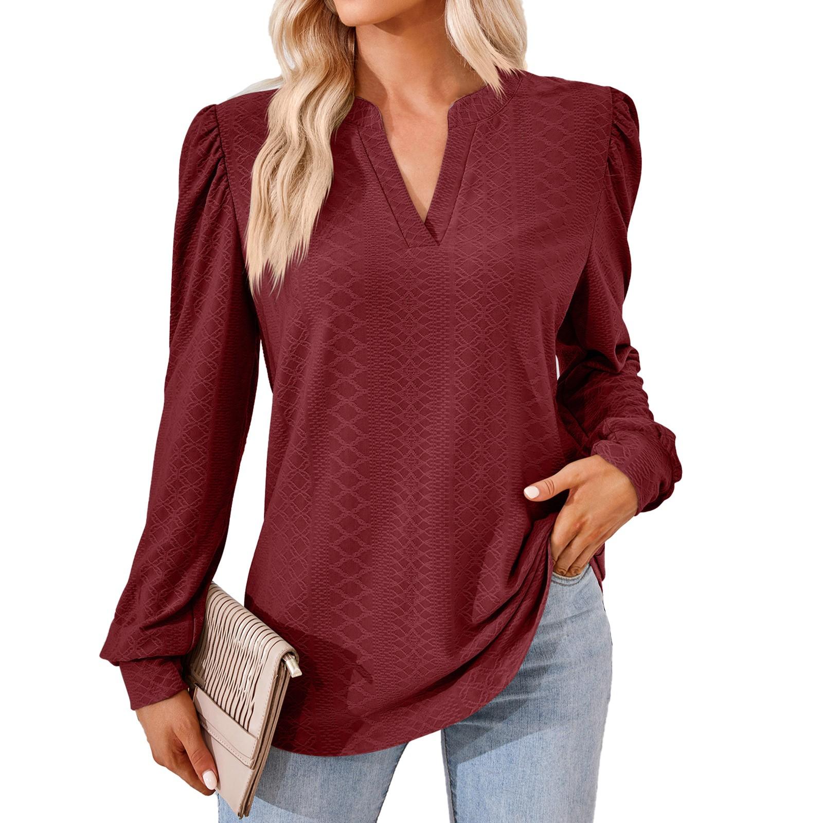 Осенне-зимняя новая однотонная свободная футболка с v-образным вырезом и длинными рукавами, женские топы XL винный