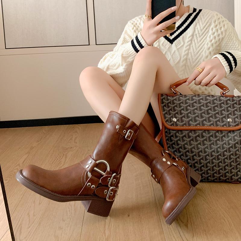 Осенне-зимняя обувь из коровьей кожи Krazing Pot, женские высокие сапоги на среднем каблуке с круглым носком и металлическими застежками на молнии 40 коричневый
