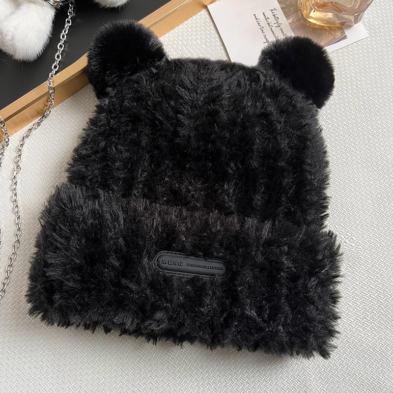 Осенне-зимняя плюшевая шапка-медведь, женская новая вязаная шапка с большой окружностью головы, меховая подкладка, утолщенная теплая защитная шапка для ушей one size (54-58cm)