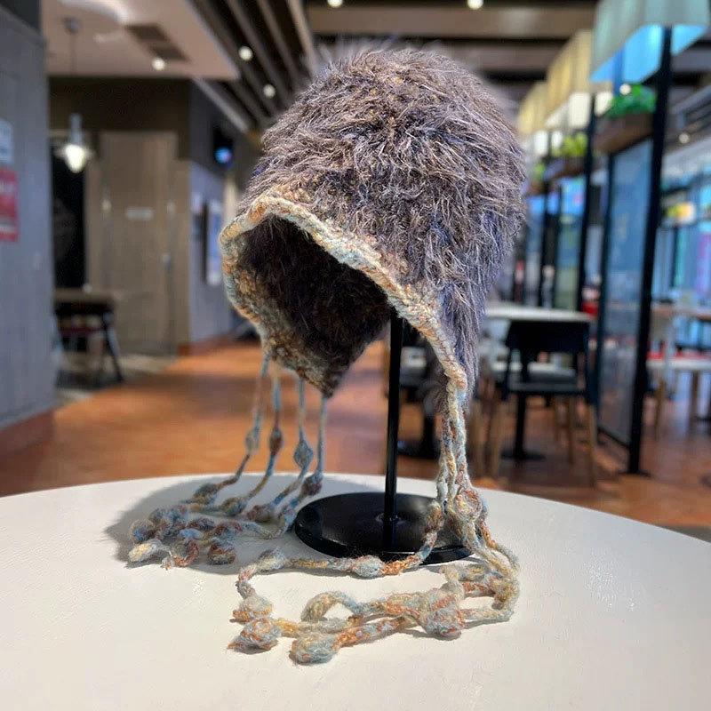 Осенне-зимняя цветная ретро вязаная шапка-ушанка с бахромой из шерсти, теплая женская шапка смешанных цветов из пуховой пряжи на шнуровке One size серый