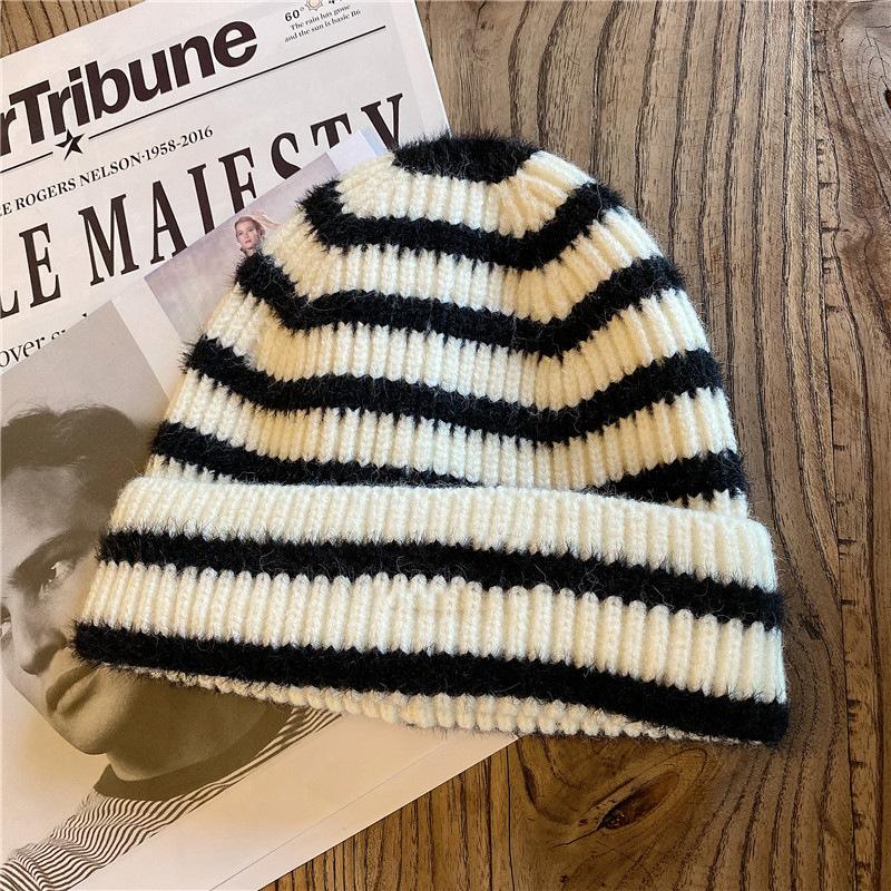 Осенние и зимние шапки женские черно-белые полосатые универсальные вязаные шапки модные теплые вязаные парные корейские версии японские шапки one size белый