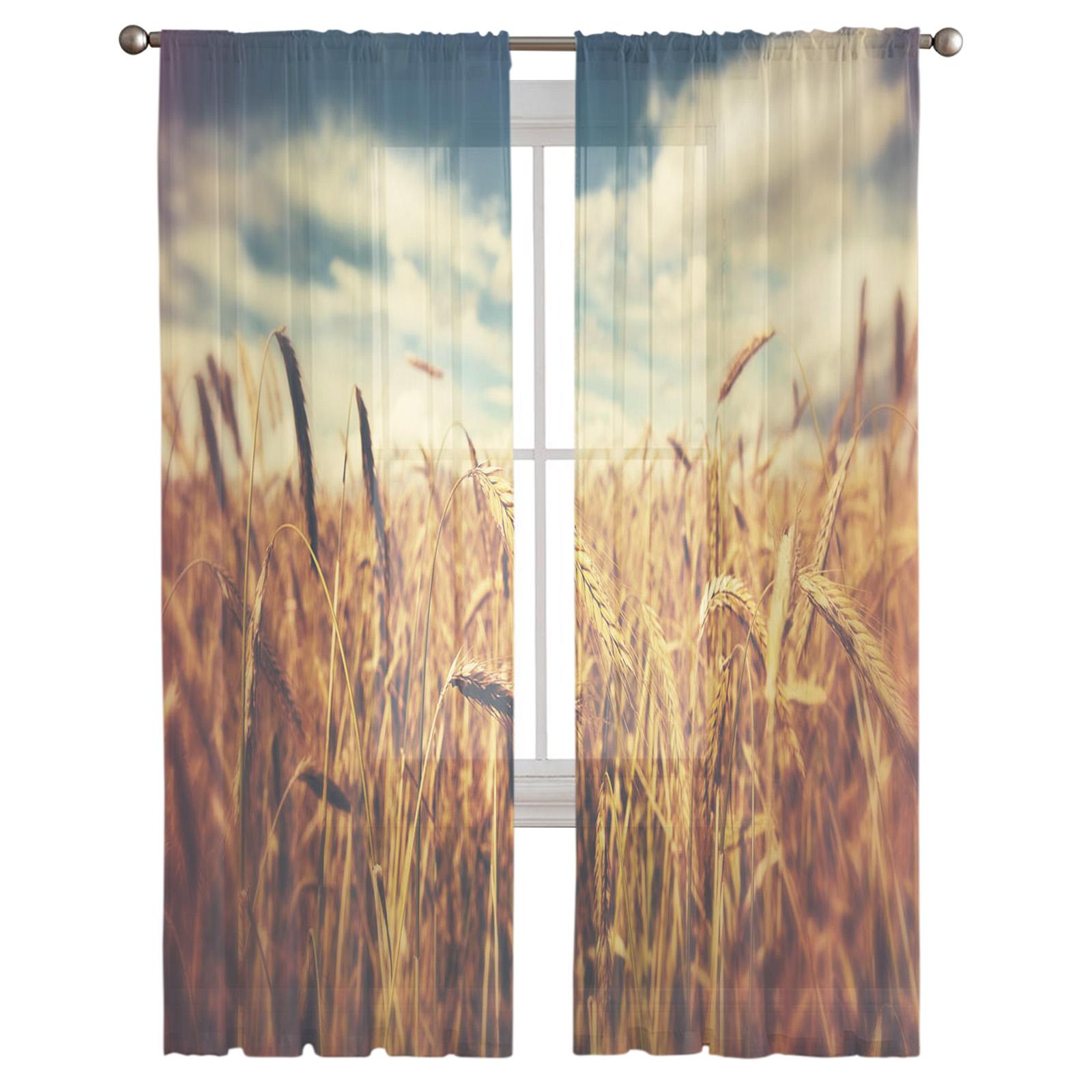 Осенние колосья пшеницы, пейзаж с рисовым полем, тюлевые шторы для украшения гостиной, современные шифоновые прозрачные вуали для кухни 135W x 114H(cm)x2
