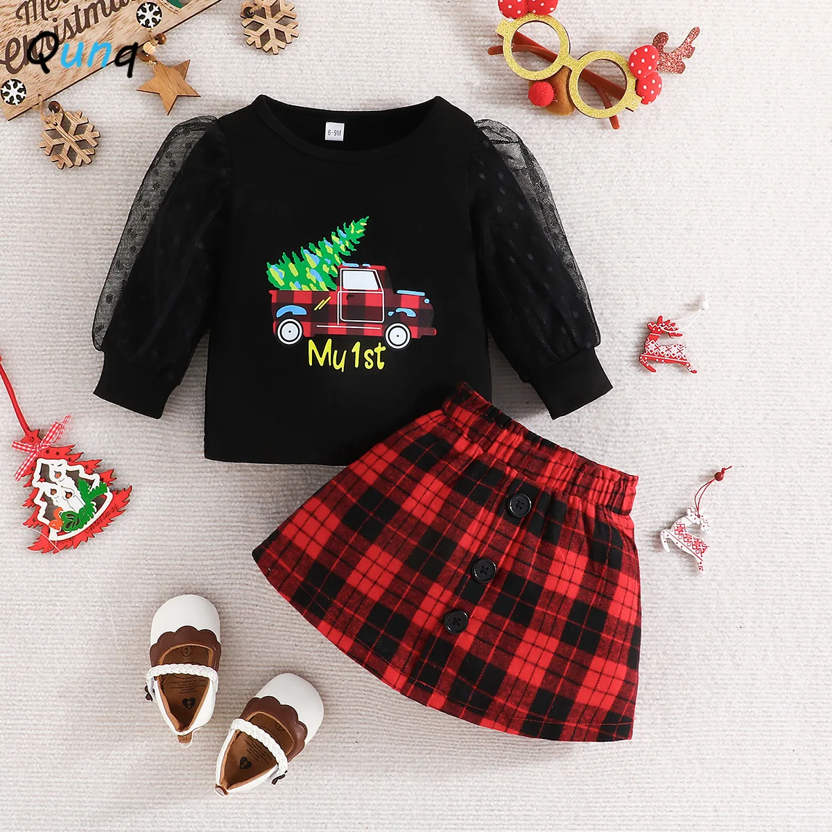 Осенний Рождественский костюм для девочек Qunq 2023, сетчатый топ с пышными рукавами и клетчатая юбка, комплект из 2 предметов, Повседневные детские костюмы на возраст 1-3 лет