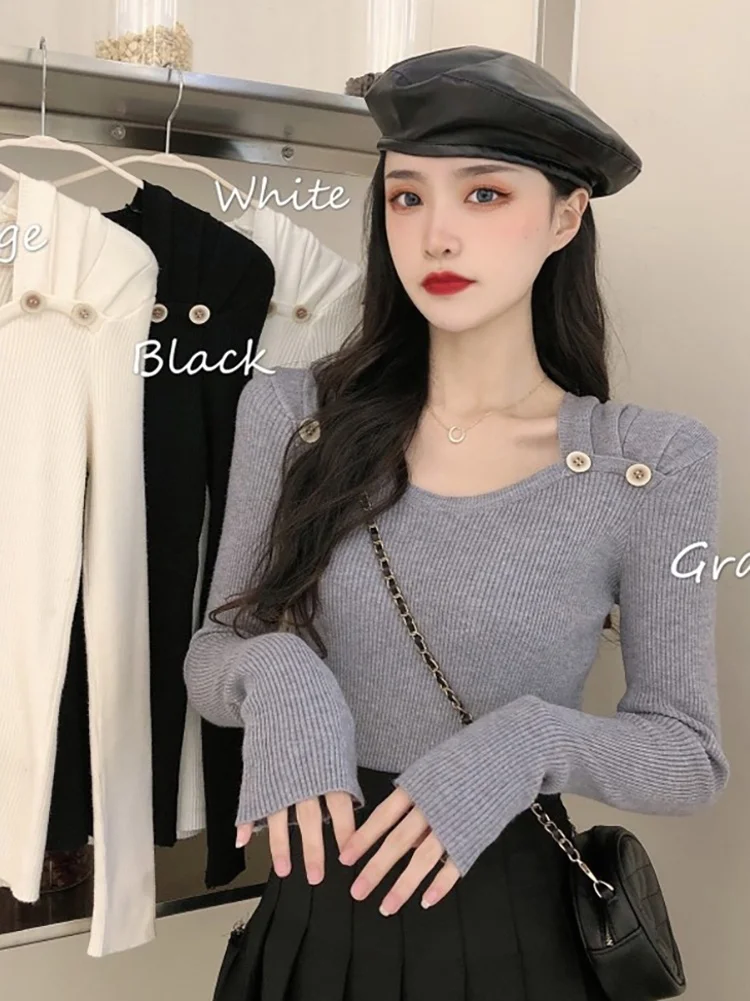 Осенний корейский свитер 2021, новинка, облегающий свитер с длинными рукавами и декоративными пуговицами, свитер с квадратным вырезом, женска...