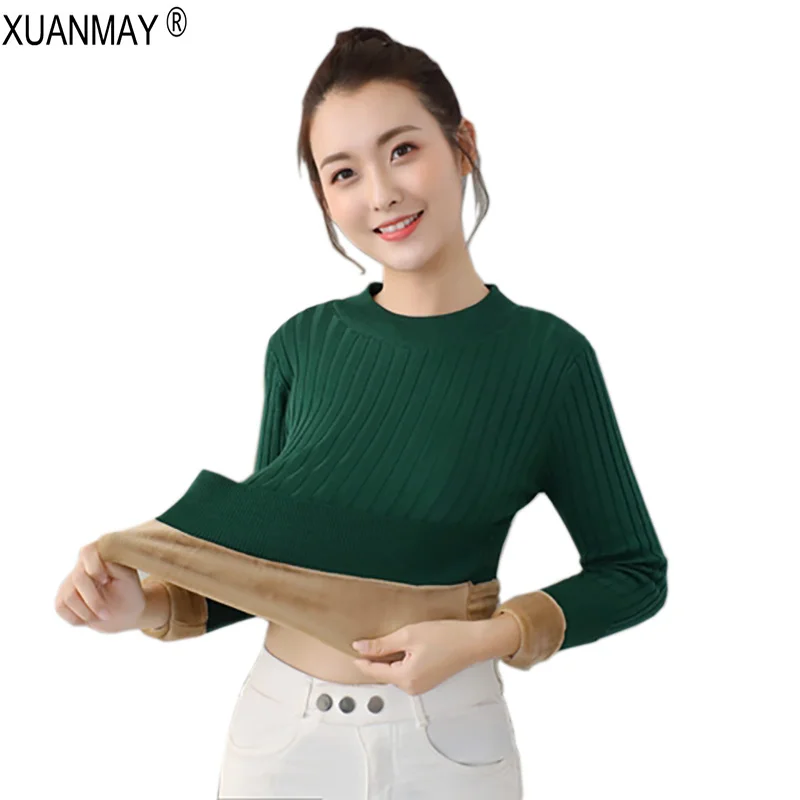 Осенний плотный бархатный свитер, нижняя рубашка, теплый пуловер с бархатной подкладкой, Женский Повседневный черный плотный свитер