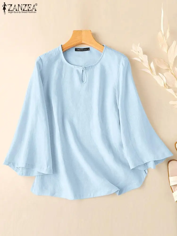 Осенняя Элегантная блузка ZANZEA, Женские однотонные повседневные топы с длинным рукавом, модная рубашка с круглым вырезом для праздника, Женская свободная хлопковая рубашка