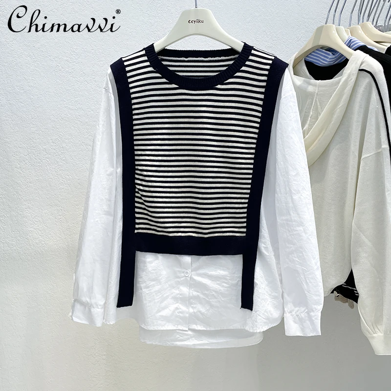 Осенняя модель 2021, блузки, имитация двух предметов, пуловер с круглым вырезом, полосатая Осенняя Корейская рубашка оверсайз