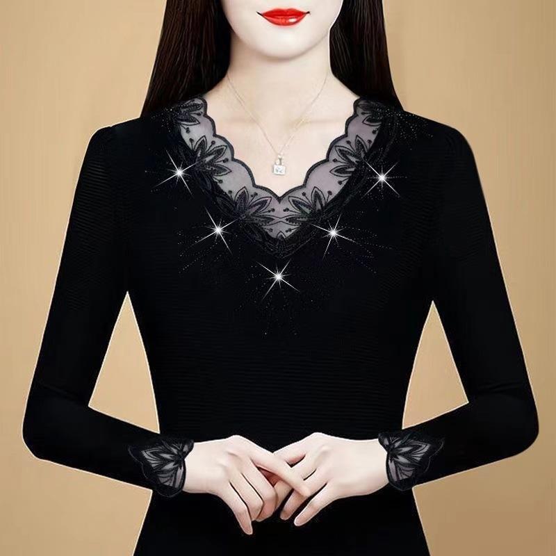 Осенняя новая черная футболка с V-образным вырезом, бархатная утолщенная рубашка с подолом, иностранный стиль, внутренний пуловер, женская рубашка 5XL