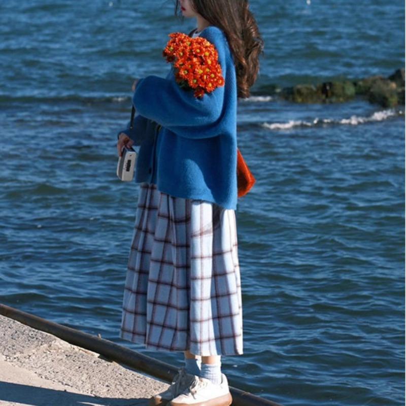Осенняя новинка ретро средней длины синяя клетчатая юбка плюс утолщенный бархат клетчатая юбка с высокой талией плиссированная юбка XL