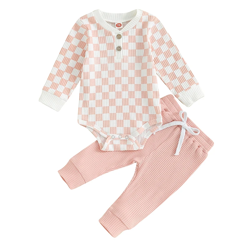 Осенняя одежда для маленьких мальчиков и девочек, шахматный комбинезон с длинным рукавом и принтом + штаны, комплект одежды для младенцев