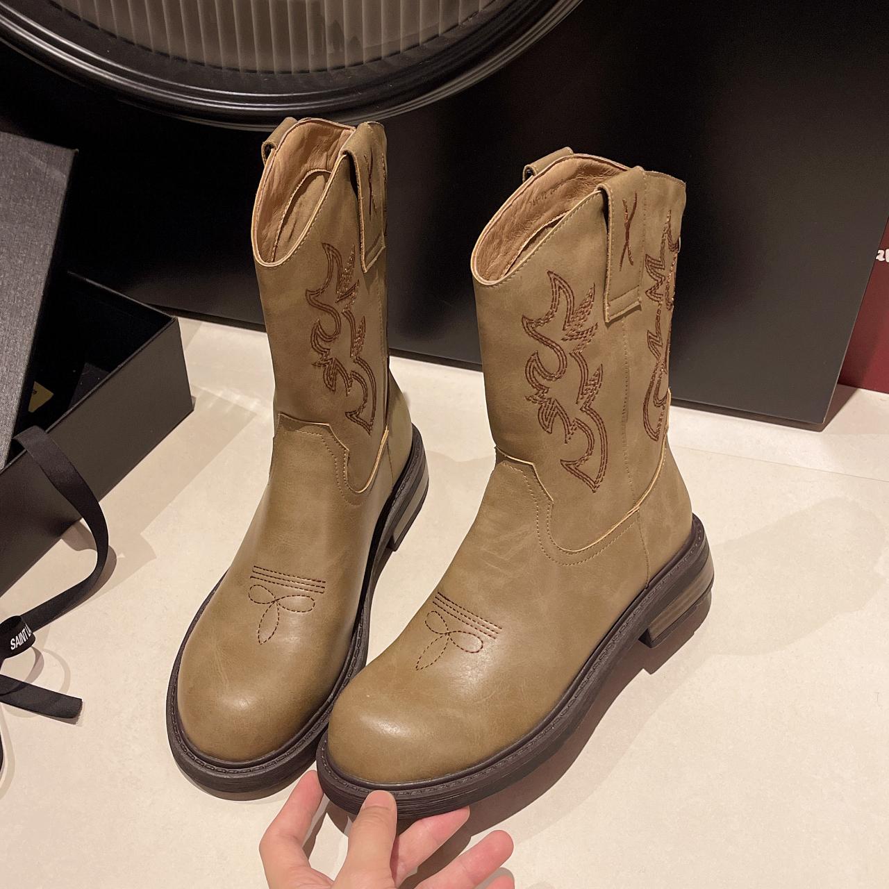 Осень Зима Женские Ковбойские Сапоги Модные Круглый Носок Западный Стиль Боты На Толстом Среднем Каблуке До Середины Икры Женские Винтажные Вышитые Кожаные Туфли 35