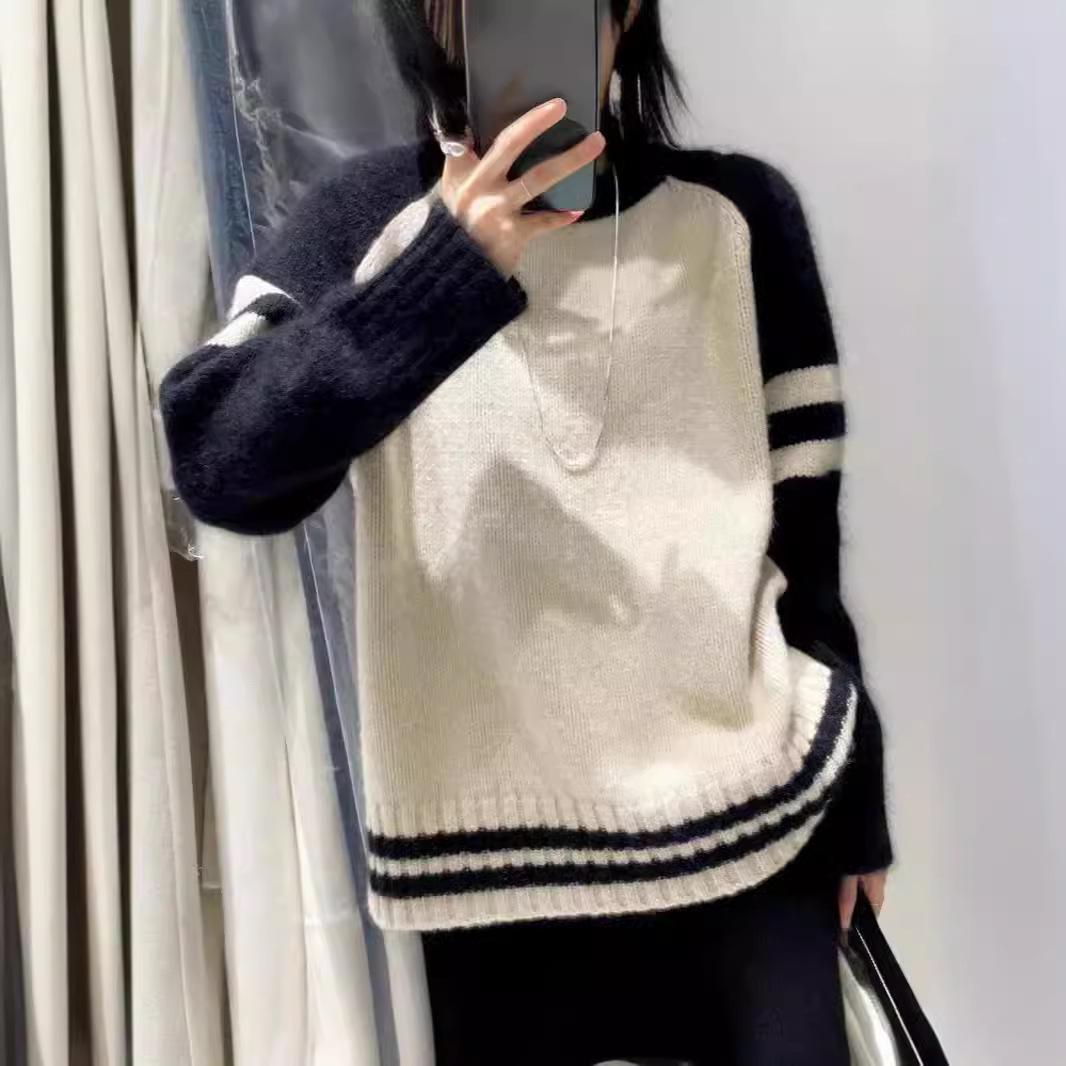 Осень/Зима Корейский Стиль Чистая Шерсть Цветовой Блок Свободный Вязаный Кашемировый Свитер для Женщин Small