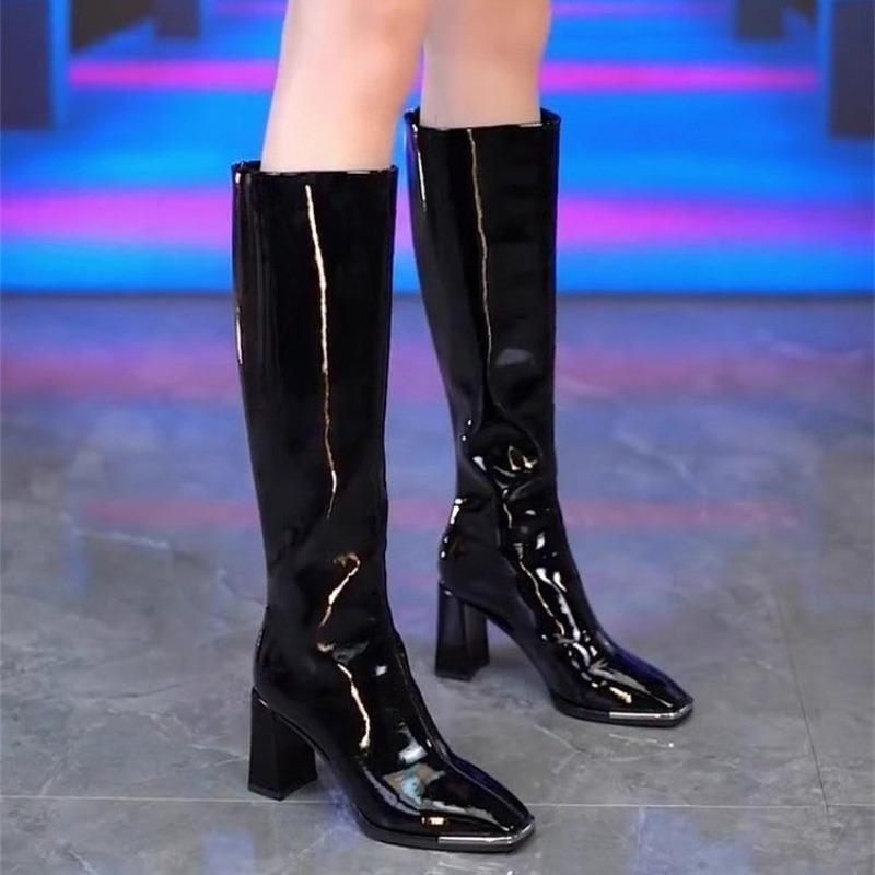 Осень Зима Новые Женские Сапоги до Колена из Лакированной Кожи Сапоги до Колена Женские Водонепроницаемые Белые Красные Черные Вечерние Туфли 41 чёрный