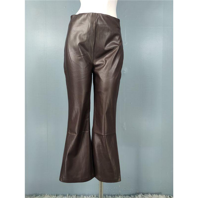 Осень-Зима 2024 Новое поступление Кофе Стильная аура Высокая талия Облегающие Подчеркивают фигуру ПУ Эластичная ткань Базовые Расклешенные брюки Brown UK16