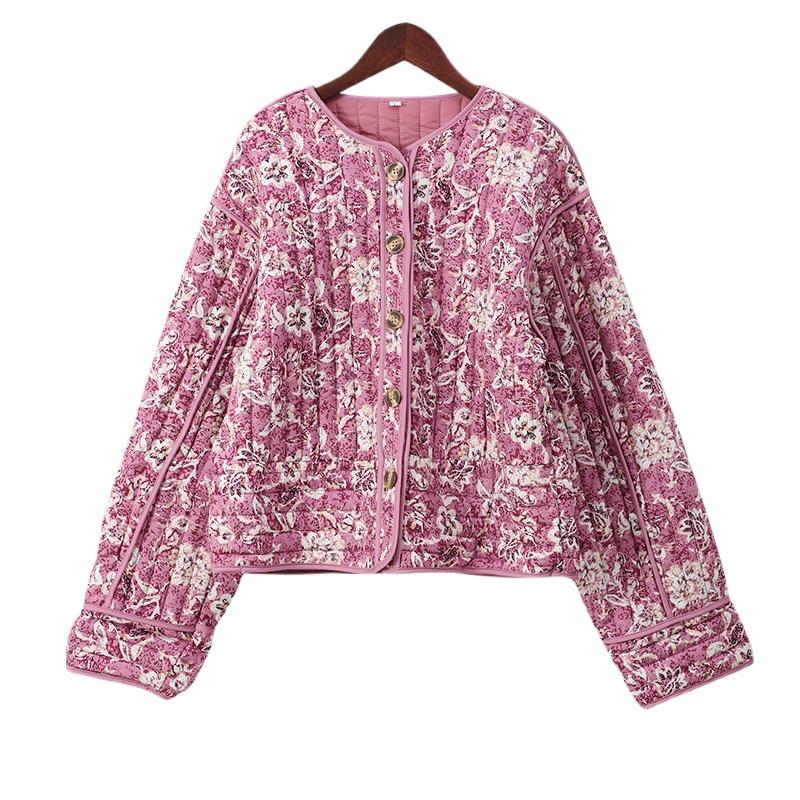 Осень-зима Цветочный принт Женская стеганая куртка Утолщенный воротник-стойка Теплое хлопковое пальто Модная женская уличная верхняя одежда L розовый