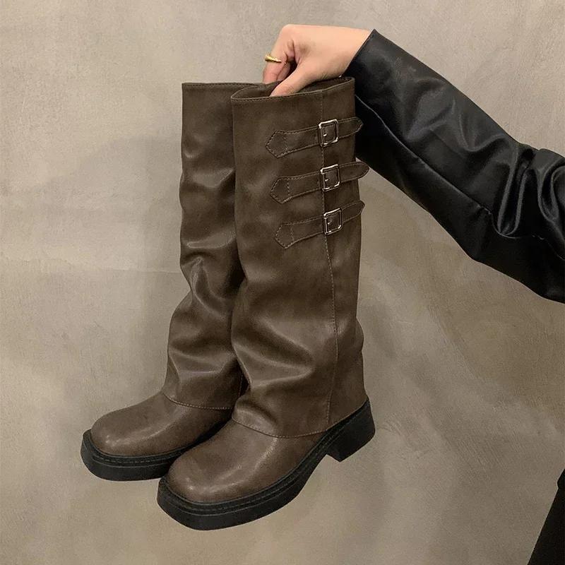 Осень-зима женские высокие сапоги рыцаря без застежек на толстом каблуке брюки длинные ботильоны в стиле ретро женская обувь Botas De Mujer 35